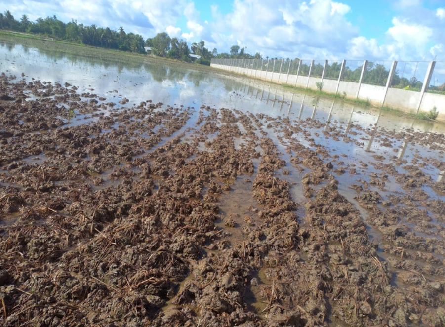 Đất trồng lúa bị nhiễm mặn gần cao tốc Cần Thơ - Cà Mau được rửa mặn bằng nước mưa, trước khi xuống giống vụ lúa mới.