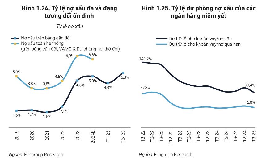 Tỷ lệ nợ xấu tại 27 ngân hàng thương mại lớn tăng từ 3,6% (quý 4/2024) lên khoảng 3,8% (quý 1/2025). Nợ xấu trên toàn hệ thống (tính trên bảng cân đối kế toán) cũng tăng từ 5% năm 2024 lên 5,3% vào tháng 2/2025. Nếu tính cả nợ xấu tiềm tàng và nợ chuyển về Công ty Quản lý tài sản (VAMC), tổng nợ xấu điều chỉnh có thể lên đến 6,6% vào cuối năm 2024.