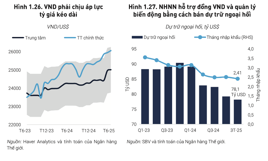 Ngoài ra, WB cho biết Ngân hàng Nhà nước đã bán ra khoảng 1 tỷ USD dự trữ ngoại hối, khiến quy mô dự trữ giảm từ 79,2 tỷ USD (tháng 12/2024) xuống còn 78,1 tỷ USD (tháng 3/2025), tương đương khoảng 2,4 tháng nhập khẩu.