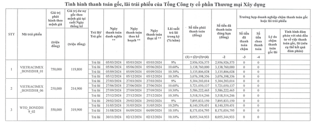 Theo đó, trong kỳ báo cáo từ 1/1/2024 - 31/12/2024, WTO đã thanh toán khoảng 168 tỷ đồng cho tổng cộng 52 kỳ trả lãi của 13 lô trái phiếu.
