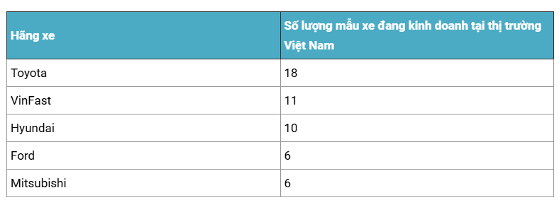 Nhìn vào top 5 hãng xe bán chạy nhất thị trường, Ford và Mitsubishi chính là 2 cái tên đang kinh doanh ít model nhất (6 mẫu) trong khi các đối thủ đều bán trên 10 mẫu khác nhau.