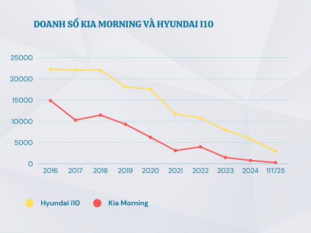 Nhìn lại giai đoạn 2016, thời điểm Kia Morning và Hyundai i10 còn chiếm tới 10,54% thị phần toàn ngành với 36.000 xe bán ra, khó ai có thể hình dung được sự sụt giảm nhanh chóng như hiện tại.