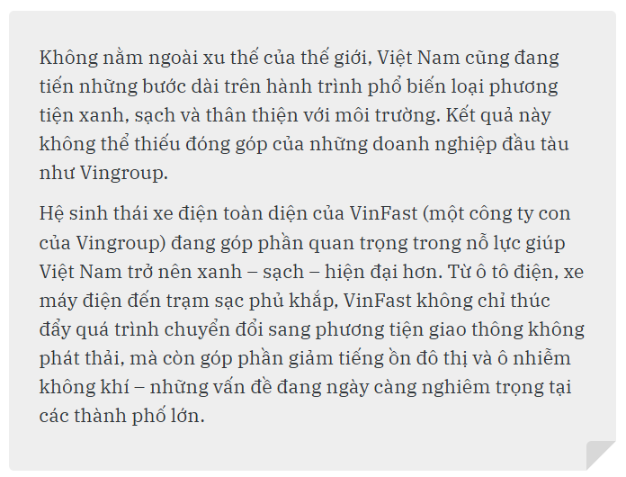 Hàng loạt chính sách hỗ trợ lâu dài và ổn định như miễn thuế, giảm phí đã giúp Na Uy gần như xóa sổ xe chạy xăng và diesel khỏi thị trường xe mới. Theo Hiệp hội Xe điện Na Uy (NEVA), tại nhiều thành phố lớn của nước này, khoảng 30% ô tô cá nhân đang lưu thông là xe điện hoàn toàn. Riêng tại thủ đô Oslo, tỷ lệ này lên tới 40%.