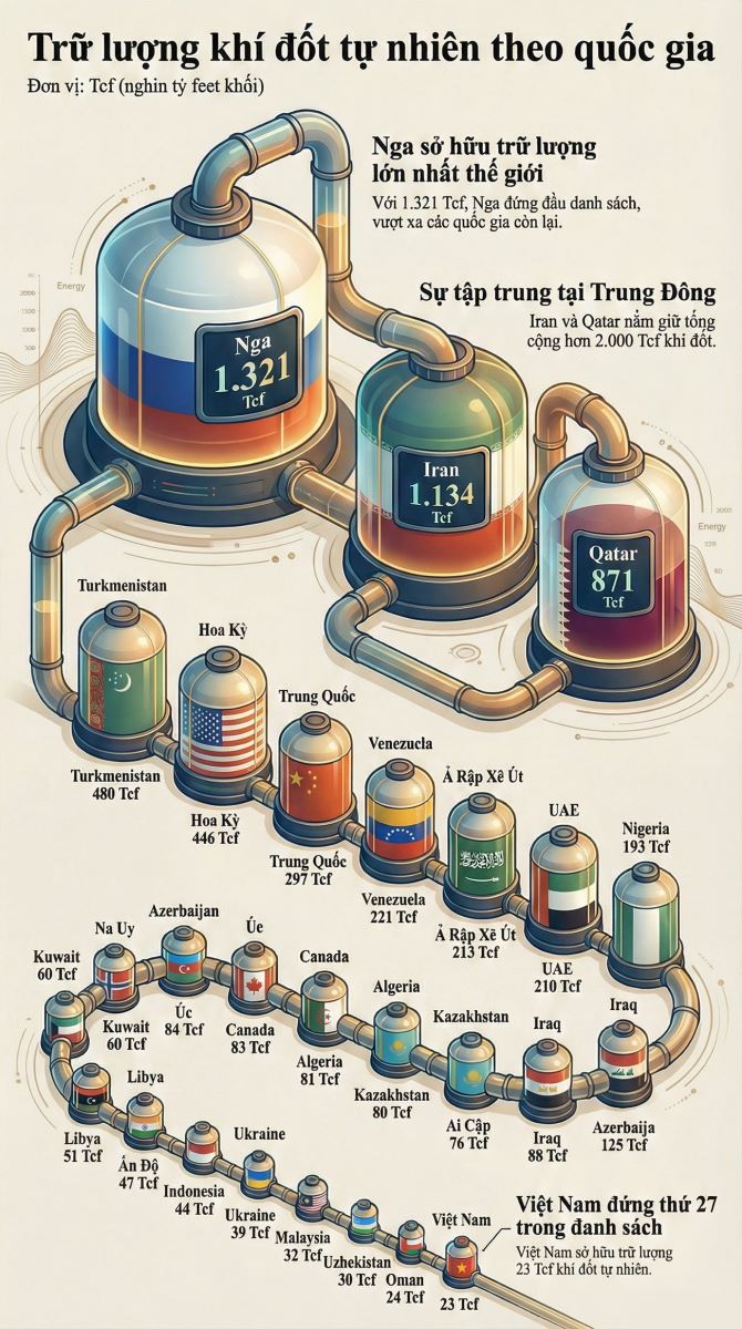 Việt Nam hiện đứng ở nhóm dưới của danh sách thống kê với trữ lượng khoảng 23 nghìn tỷ feet khối. Dù con số này khiêm tốn so với các "gã khổng lồ" năng lượng, đây vẫn là nguồn tài nguyên chiến lược quan trọng để đáp ứng nhu cầu sản xuất điện và phát triển công nghiệp trong nước trong lộ trình chuyển dịch năng lượng.