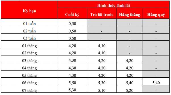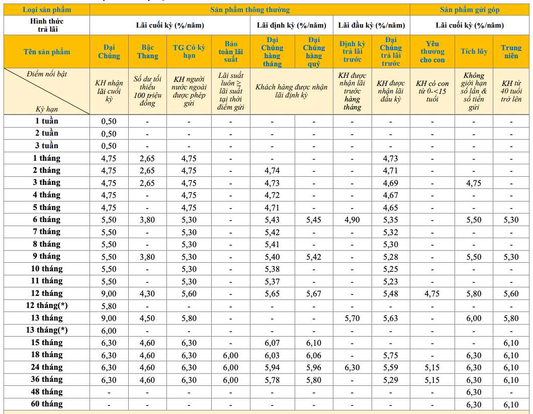 * Thông tin về lãi suất chỉ mang tính chất tham khảo và có thể thay đổi trong từng thời kì. Vui lòng liên hệ điểm giao dịch ngân hàng gần nhất hoặc hotline để được tư vấn.