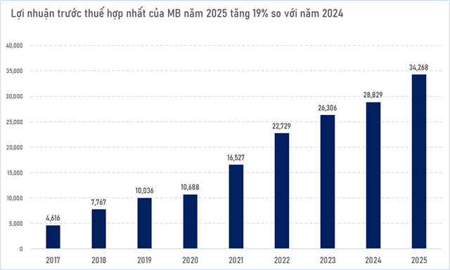 Về lợi nhuận, MB vừa có quý đầu tiên vượt trên 10 nghìn tỷ. Cụ thể, quý IV/2025, lợi nhuận trước thuế nhà băng này đạt hơn 11 nghìn tỷ đồng. Theo đó, lợi nhuận cả năm 2025 đạt hơn 34,2 nghìn tỷ đồng, tăng 19%.