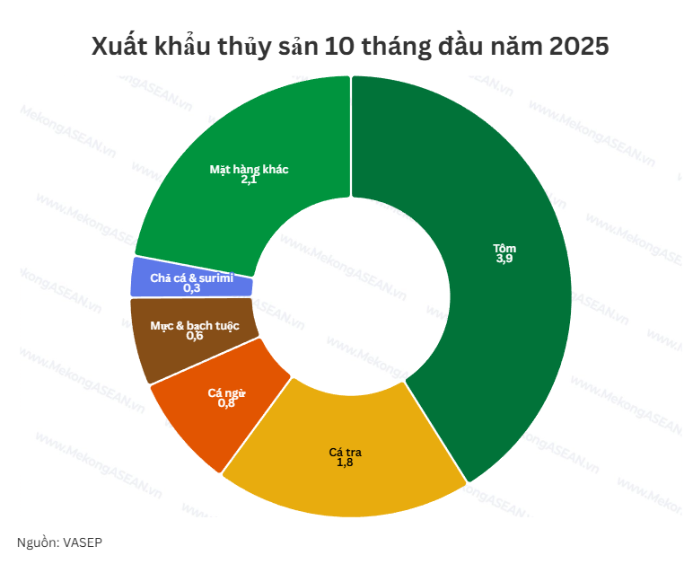 Trái lại, thị trường Mỹ bước vào giai đoạn nhiều biến động. Dù tính chung 10 tháng xuất khẩu thủy sản sang Mỹ vẫn tăng so với cùng kỳ, đạt khoảng 1,66 tỷ USD, nhưng xu hướng giảm đã bắt đầu rõ rệt từ quý 3/2025 do thuế đối ứng 20% áp dụng từ tháng 8.