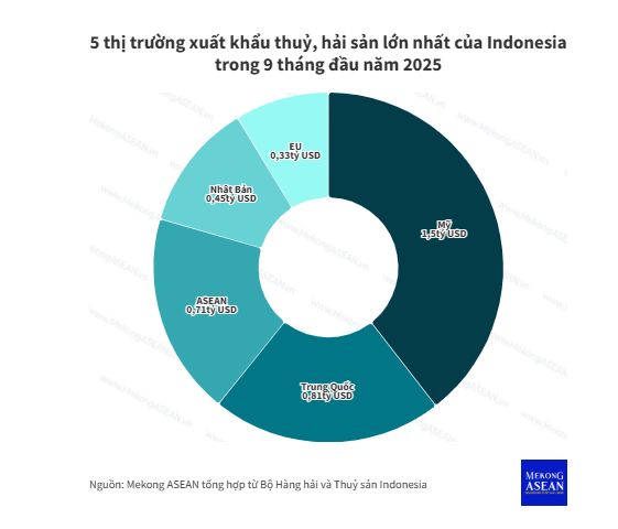 Báo cáo của Tổng cục Tăng cường Năng lực cạnh tranh các sản phẩm thuỷ hải sản cũng chỉ ra, 5 thị trường xuất khẩu thuỷ, hải sản chính của Indonesia là Mỹ (1,5 tỷ USD), Trung Quốc (812,8 triệu USD), ASEAN (712 triệu USD), Nhật Bản (448,3 triệu USD) và Liên minh châu Âu (331,3 triệu USD).