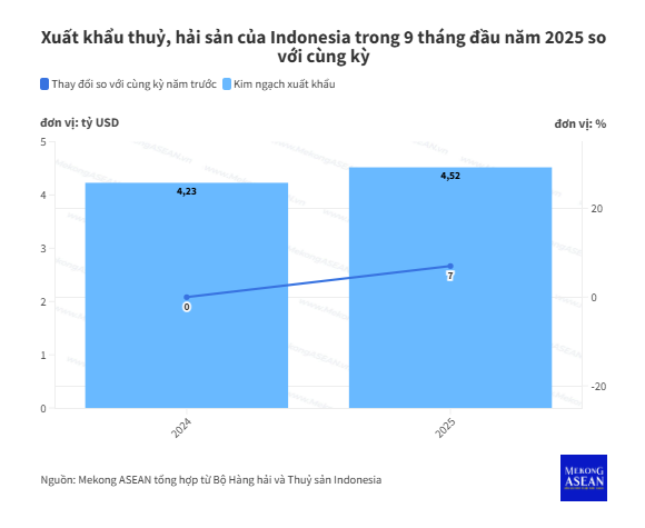 Theo số liệu của Tổng cục Tăng cường Năng lực cạnh tranh các sản phẩm thuỷ hải sản (thuộc Bộ Hàng hải và Thuỷ sản Indonesia), trong 9 tháng đầu năm 2025, xuất khẩu thuỷ, hải sản của nước này đạt tổng cộng 4,52 tỷ USD, tăng khoảng 7% so với cùng kỳ năm 2024 (YoY). Trong đó, tôm vẫn là mặt hàng xuất khẩu chủ lực của Indonesia, với kim ngạch 1,4 tỷ USD, chiếm 30% tổng kim ngạch xuất khẩu thuỷ, hải sản.