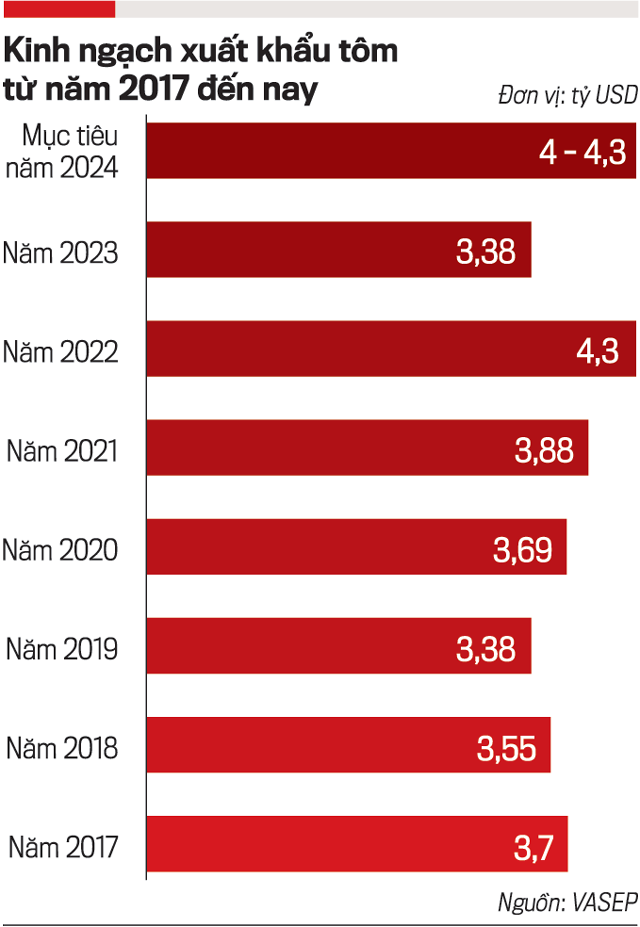 Cụ thể: năm 2017 đạt 3,7 tỷ USD; năm 2018 là 3,55 tỷ USD; năm 2019 là 3,38 tỷ USD; năm 2020 là 3,69 tỷ USD; năm 2021 đạt 3,88 tỷ USD. Năm 2022, xuất khẩu tôm lập kỷ lục với 4,3 tỷ USD. Tuy nhiên đến năm 2023, xuất khâu tôm chỉ còn 3,38 tỷ USD, giảm 21,7% so với năm 2022. Năm 2024, ngành tôm phấn đấu đạt kim ngạch xuất khẩu 4 - 4,3 tỷ USD. Với tốc độ tăng trưởng này, có thể nói mục tiêu xuất khẩu 10 tỷ USD của ngành tôm là bất khả thi.