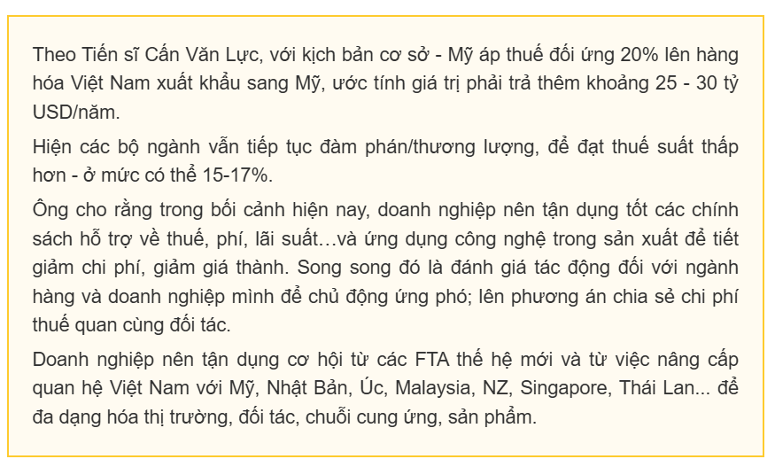 Theo TS. Cấn Văn Lực, các bộ ngành vẫn tiếp tục đàm phán để đưa mức thuế đối ứng về dưới 20%.