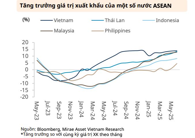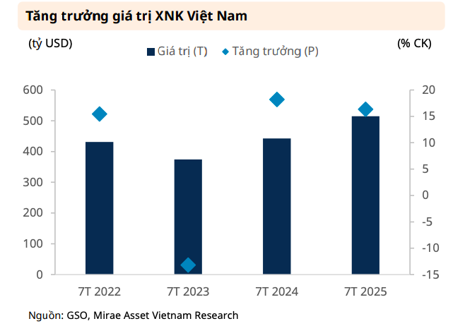 Theo báo cáo của Chứng khoán Mirae Asset Việt Nam, hoạt động xuất nhập khẩu của Việt Nam trong 7 tháng đầu năm 2025 vẫn duy trì đà tăng trưởng ổn định, dù tốc độ có phần chậm lại so với cùng kỳ năm trước. Tổng giá trị xuất nhập khẩu đạt 514,7 tỷ USD, tăng 16,3% so với cùng kỳ, thấp hơn mức tăng 18,2% của năm 2024. Trong đó, kim ngạch nhập khẩu đạt 252,2 tỷ USD (tăng 17,9%), còn xuất khẩu đạt 262,4 tỷ USD (tăng 14,8%).