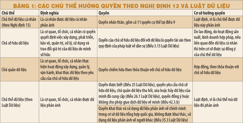Đáp ứng những nhu cầu này, Luật Dữ liệu ghi nhận những quyền mang tính chất tài sản của các chủ thể khác nhau đối với khối các dữ liệu số có thể khai thác, mang lại lợi ích cho người có quyền. Những chủ thể này lần đầu tiên được gọi tên trong Luật Dữ liệu: chủ sở hữu dữ liệu, chủ quản dữ liệu... Các chủ thể này hưởng những quyền mang tính chất tài sản, theo đó có quyền chiếm hữu, khai thác, dụng ích, hưởng lợi và định đoạt đối với những dữ liệu thuộc quyền kiểm soát, quản lý của mình (xem bảng 1).