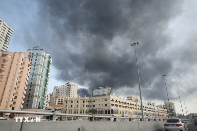 Khói bốc lên sau cuộc tấn công của Iran nhằm vào trụ sở Hạm đội thứ 5 của Mỹ ở Manama, Bahrain ngày 28/2/2026. (Ảnh: AA/TTXVN)