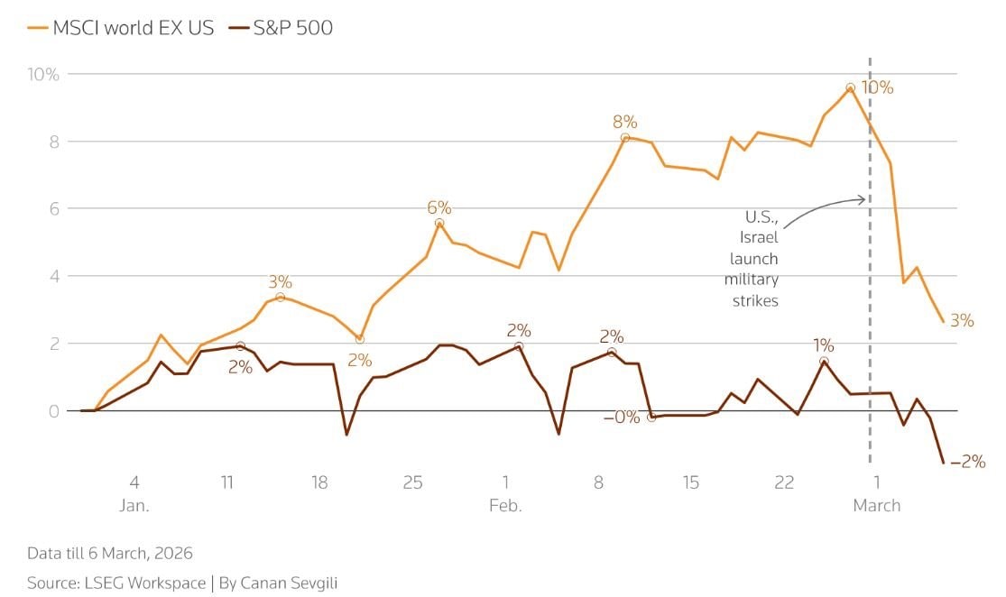 Chỉ số MSCI World ex-US lao dốc sau các cuộc không kích của Mỹ và Israel nhằm vào Iran, trong khi S&P 500 tỏ ra vững vàng hơn khi nhà đầu tư ưu tiên thị trường Mỹ - nơi nền kinh tế ít phụ thuộc vào nhập khẩu năng lượng.