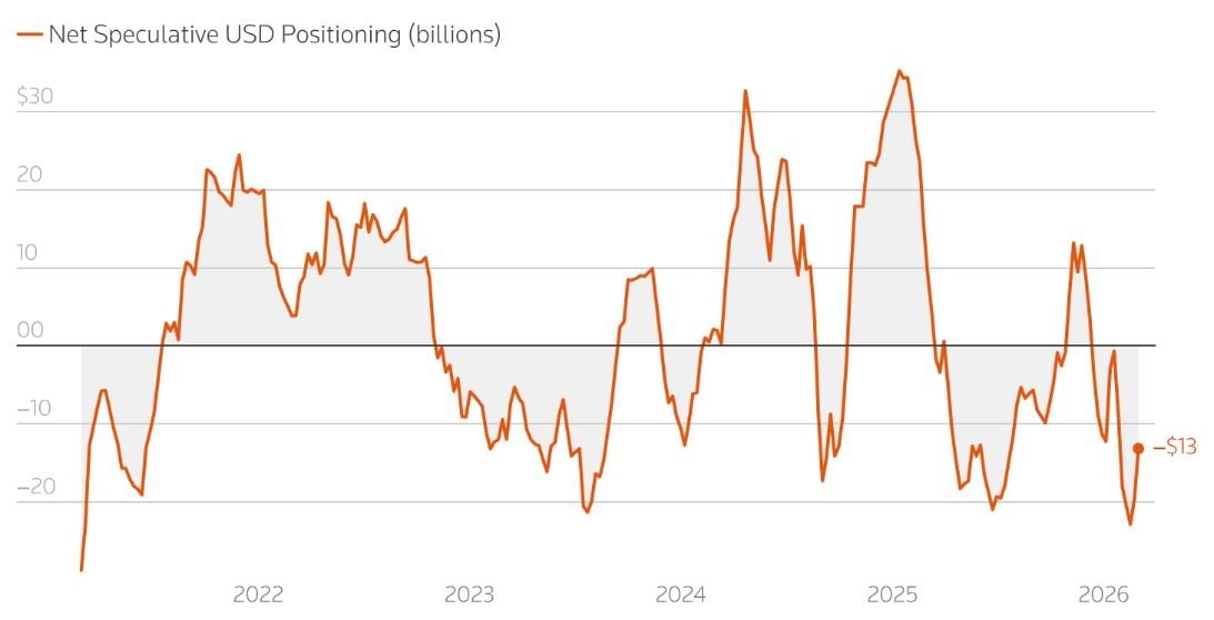 Biểu đồ cho thấy vị thế đầu cơ hàng tuần đối với USD từ đầu năm 2021 đến tháng 2/2026: khi đường nằm trên 0 nghĩa là nhà giao dịch đặt cược USD tăng, dưới 0 là đặt cược USD giảm.
